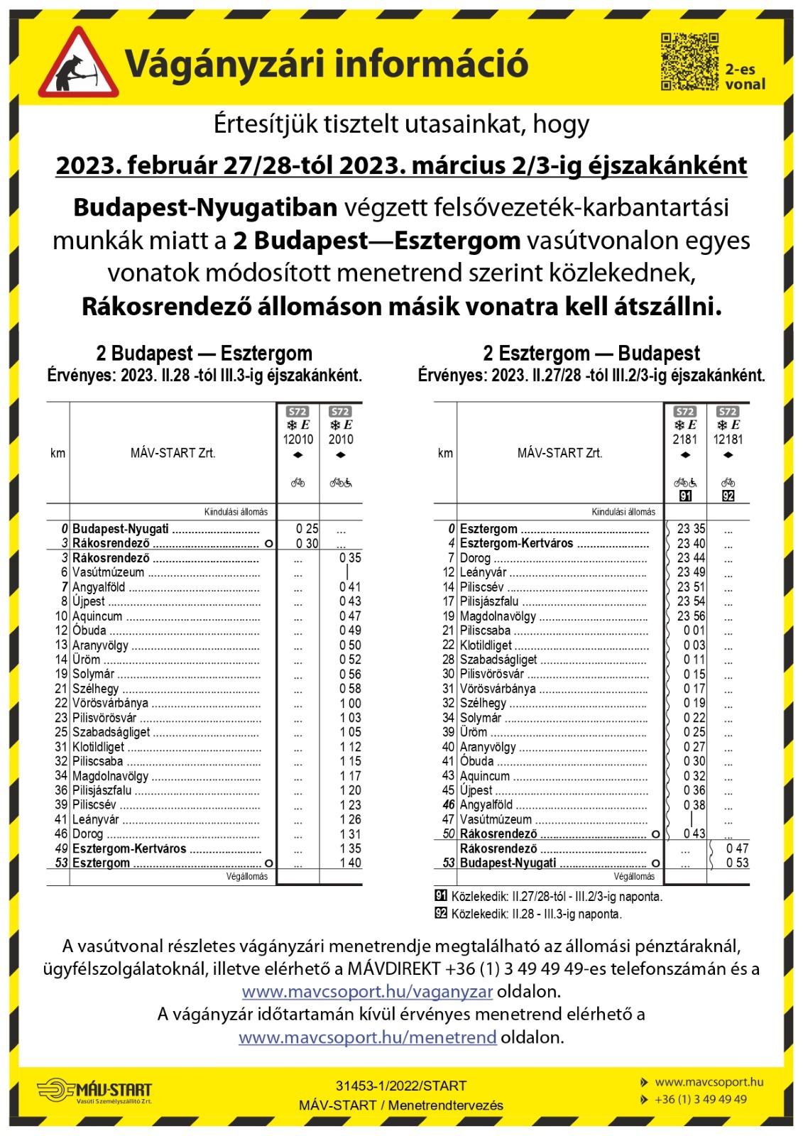 Ezúton tájékoztatjuk a Tisztelt Lakosságot, hogy 2023. február 27/28-tól 2023. március 2/3-ig éjszakánként Budapest-Nyugatiban végzett felsővezeték-karbantartási munkák miatt a 2 Budapest—Esztergom vasútvonalon egyes vonatok módosított menetrend szerint közlekednek, Rákosrendező állomáson másik vonatra kell átszállni.