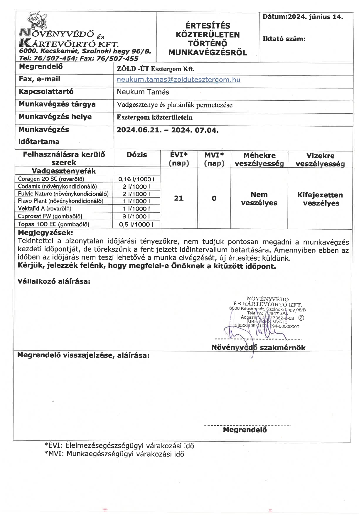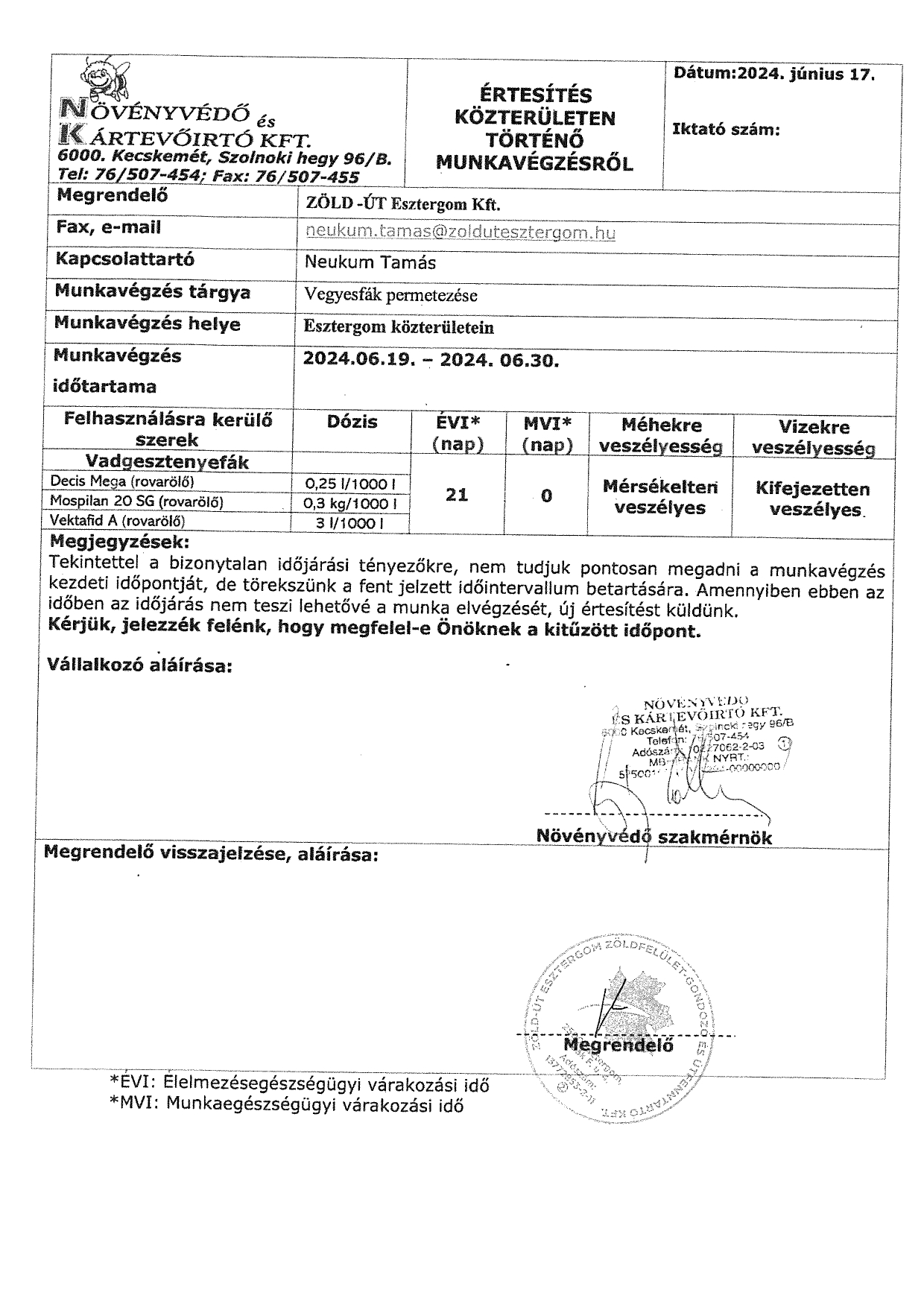 Ezúton is értesítjük a tisztelt lakosságot, hogy a Zöld-Út Esztergom Kft. 06.21 és 07.04 között ismételten növényvédelmi kezelést (vadgesztenye és platánfák permetezése) végez Esztergom Megyei Jogú Város közterületein.
