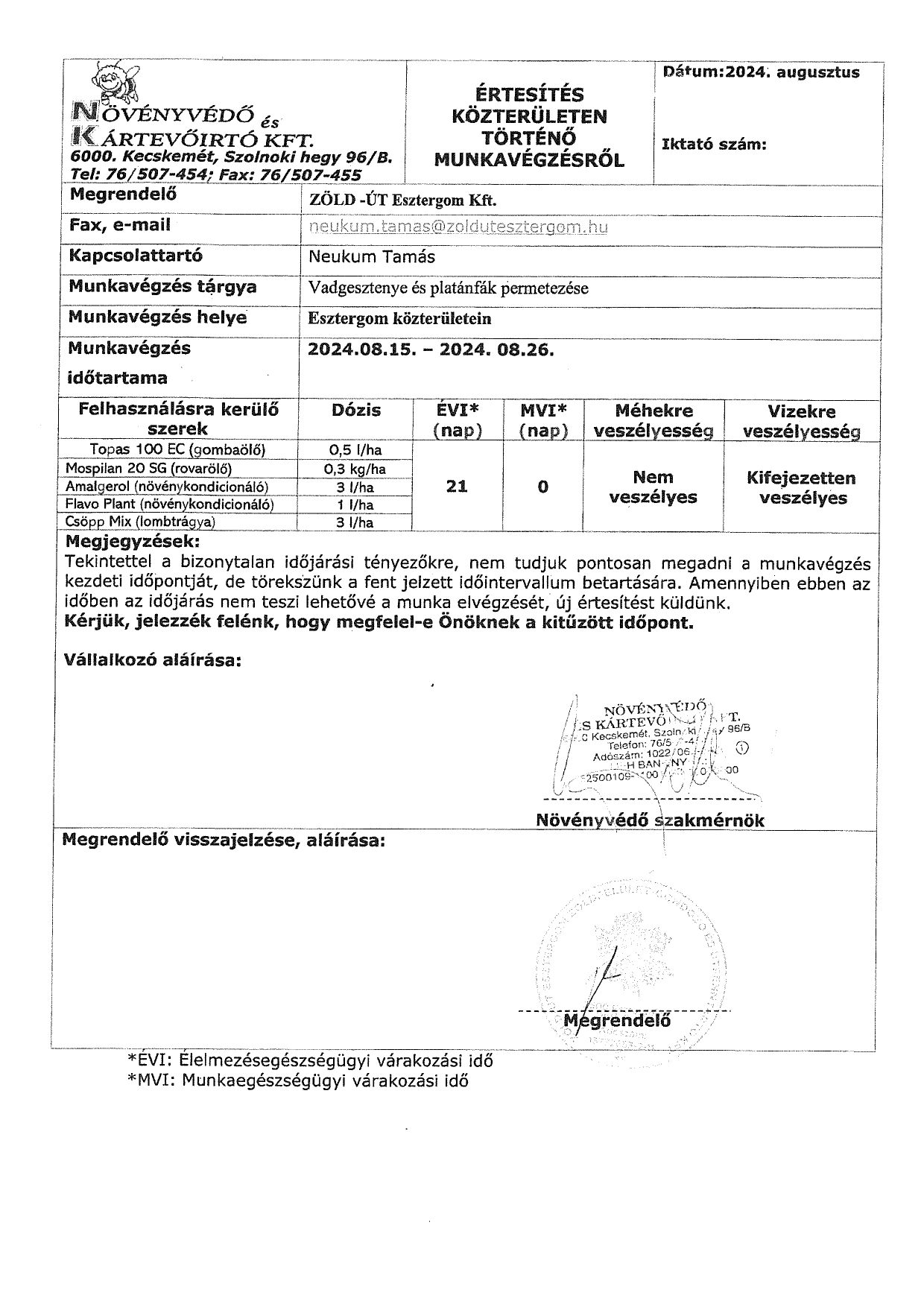 Tájékoztatjuk a Tisztelt Lakosságot, hogy a Zöld-Út Esztergom Kft. munkatársai 2024.08.15-2024.08.26. között vadgesztenye- és platánfák permetezését végzik.