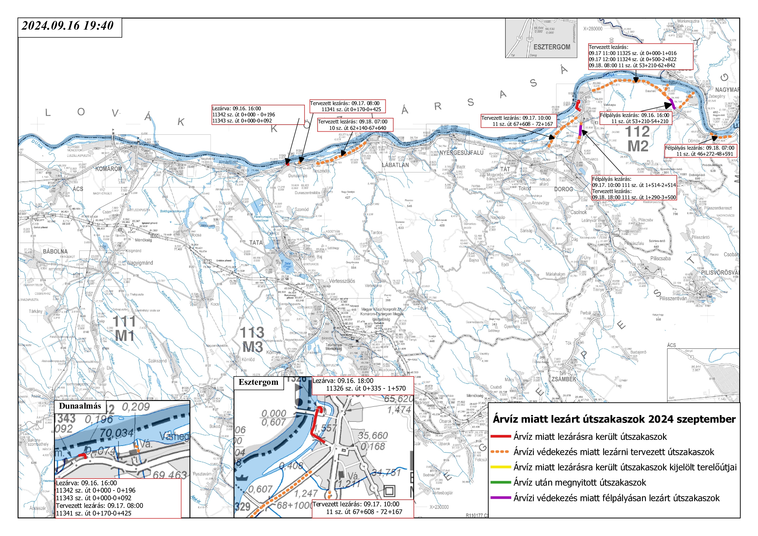 A mai napon (09.17.) 10:00 órától gátépítés miatt félpályás útlezárás lesz a 111-es út 1 km-es szakaszán (az 1+514-2+514 km szelvények közötti szakaszon), valamint magas vízállás miatt délelőtt 10:00 órától teljes útlezárás alá kerül a 11-es út Esztergom-Tát közötti szakasza 4,6 km hosszúságban (a 67+608-72+167 km szelvények között).