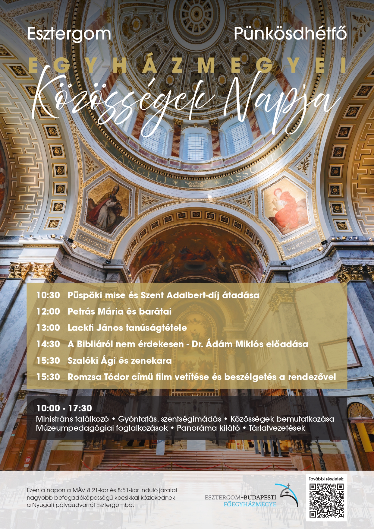 A Esztergom–Budapesti Főegyházmegye május 25-én, Pünkösdhétfőn rendezi meg az Egyházmegyei Közösségek Napját, amelyre 10:00 és 17:30 között várják a híveket és az érdeklődőket. A rendezvény központi helyszíne az esztergomi bazilika előtti tér és környéke lesz, ahol egész nap lelki és közösségi programok zajlanak majd.