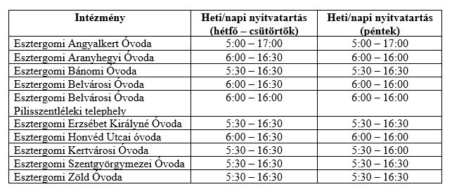 A nemzeti köznevelésről szóló 2011. évi CXC. törvény értelmében a fenntartó határozza meg az adott nevelési évben a heti és éves nyitvatartási időt a nevelési intézményekben. Az első napirendi pont keretében az Esztergom Város Önkormányzata fenntartásában lévő kilenc óvoda tekintetében kellett meghatározni a 2021/2022. nevelési évben az intézmények nyitvatartását, ami a Képviselő-testület döntése szerint a következőképpen alakul:
