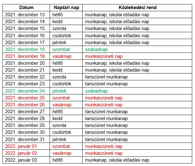 A karácsonyi, szilveszteri és újévi ünnepek, valamint az alap- és középfokú tanintézmények téli szünete körüli napokon Esztergom Város helyi közforgalmú menetrendszerinti autóbuszjáratait a 20/2021. (VI. 8.) EMMI rendelet figyelembevételével – az országos menetrendi naptárnak megfelelően, illetve egyelőre azt feltételezve, hogy a járványügyi intézkedések további szigorítást nem tesznek szükségessé – az alábbi közlekedési rend szerint közlekednek: