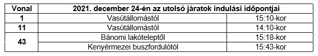 A Volánbusznál kialakult gyakorlatnak megfelelően, Esztergom Város helyi közforgalmú menetrendszerinti autóbusz-közlekedésében 2021. december 24-én (pénteken „SZENTESTE”) a helyi autóbuszjáratokat a szabadnapi menetrend szerint, járatleállításokkal közlekedtetik. A 2021. december 24-én (pénteken „SZENTESTE”) az utolsó járatok az alábbiak szerint indulnak: