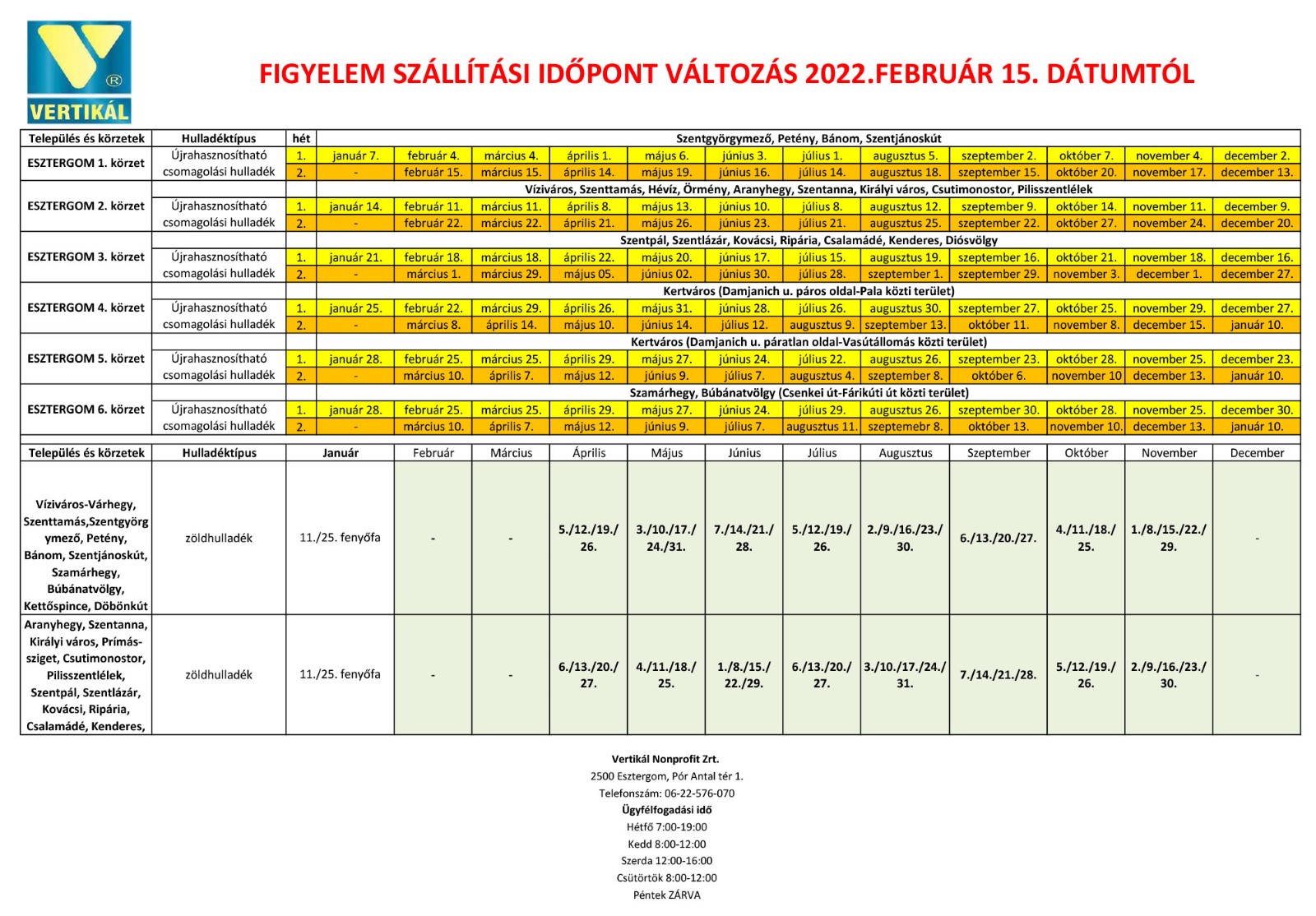 Mint minden évben a zöldjárat idén is áprilisban indul, kérjük ezt megelőzően zöldhulladékot ne helyezzenek ki. A tavalyi évhez hasonlóan a zöldhulladékot kizárólag a VERTIKÁL Nonprofit Zrt. logójával ellátott, lebomló hulladékgyűjtő zsákban szállítják el, egyéb zsákokban kihelyezett zöldhulladékot nem. A zsákokon kívül elszállítjuk a kisebb, maximum 10 cm átmérőjű faágakat, gallyakat is, amelyek kb. egyméteresre darabolva, megfelelő vastagságú zsineggel kötegelve helyezhetők ki a zsákok mellé. Kérjük ügyeljen arra, hogy a zsákba kizárólag zöldhulladék kerüljön. Amennyiben munkatársaink a zöldhulladékos zsákokban háztartási hulladékot vagy egyéb nem odavaló anyagot találnak, a zsákot nem szállítják el. Az említett zsákok az ügyfélszolgálaton vehetőek át (évente 40 db), továbbá lehetőség lesz plusz zsák vásárlására is, ezen pontok megjelöléséről tájékozódjon ügyfélszolgálaton. A zsákokat minden esetben jól látható, járművekkel megközelíthető helyre helyezze ki, szállítási napokon reggel 6 óráig.