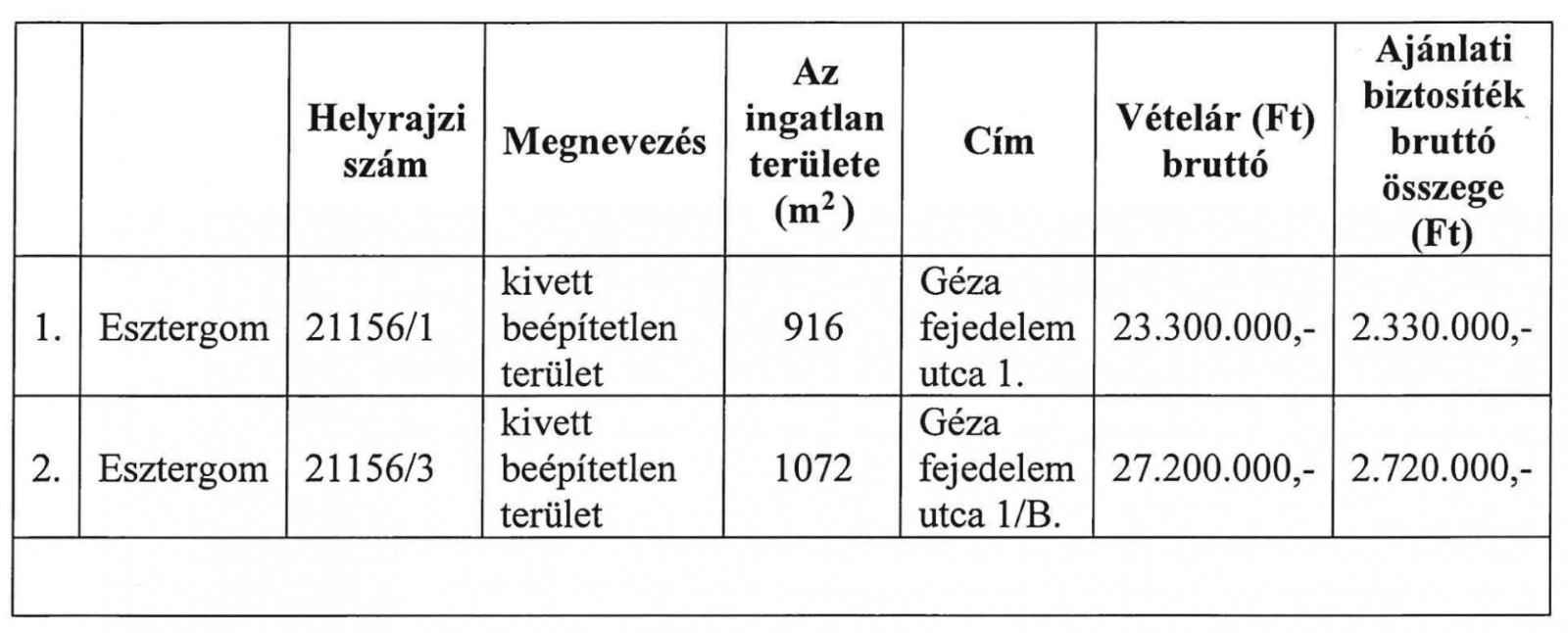 Esztergom Megyei Jogú Város Önkormányzata versenytárgyalás útján értékesíti az alábbi építési telkeket: