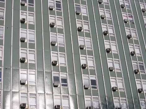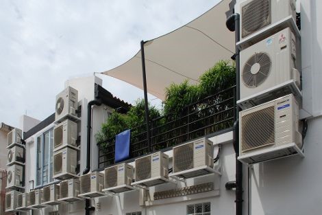 Társasházak esetében lehetőleg a lapostetőn vagy a teraszon, a közterületről takart módon legyen elhelyezve a kültéri egység. Amennyiben ezekre nincsen lehetőség, az ablak mellett vagy alatt, szintenként ugyanazon a helyen, a homlokzaton egy vonalba kerüljenek a berendezések. Családi házaknál is javasolt a takart kialakítás.