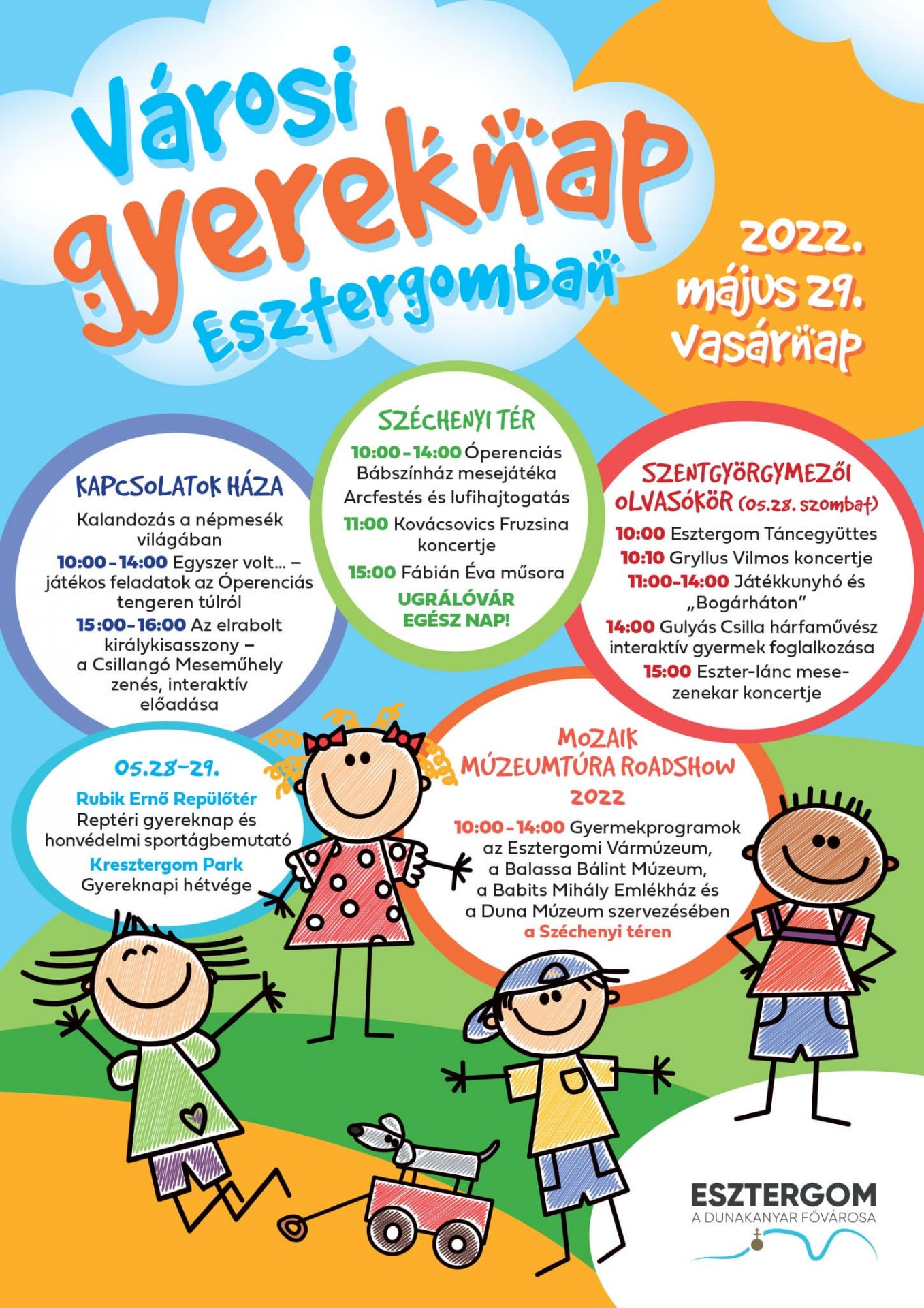 Május 29-én, vasárnap a Széchenyi téren arcfestés, lufihajtogatás, egész napos ugrálóvár várja a kicsiket. A Mozaik Múzeum Roadshow 4 esztergomi múzeum szervezésében várja a gyerekeket. 11 órától Kovácsovics Fruzsina, 15 órától pedig Fábián Éva lép fel. A Kapcsolatok házában pedig délelőtt 10 órától a népmesék világába kalandozhatnak a gyerekek.