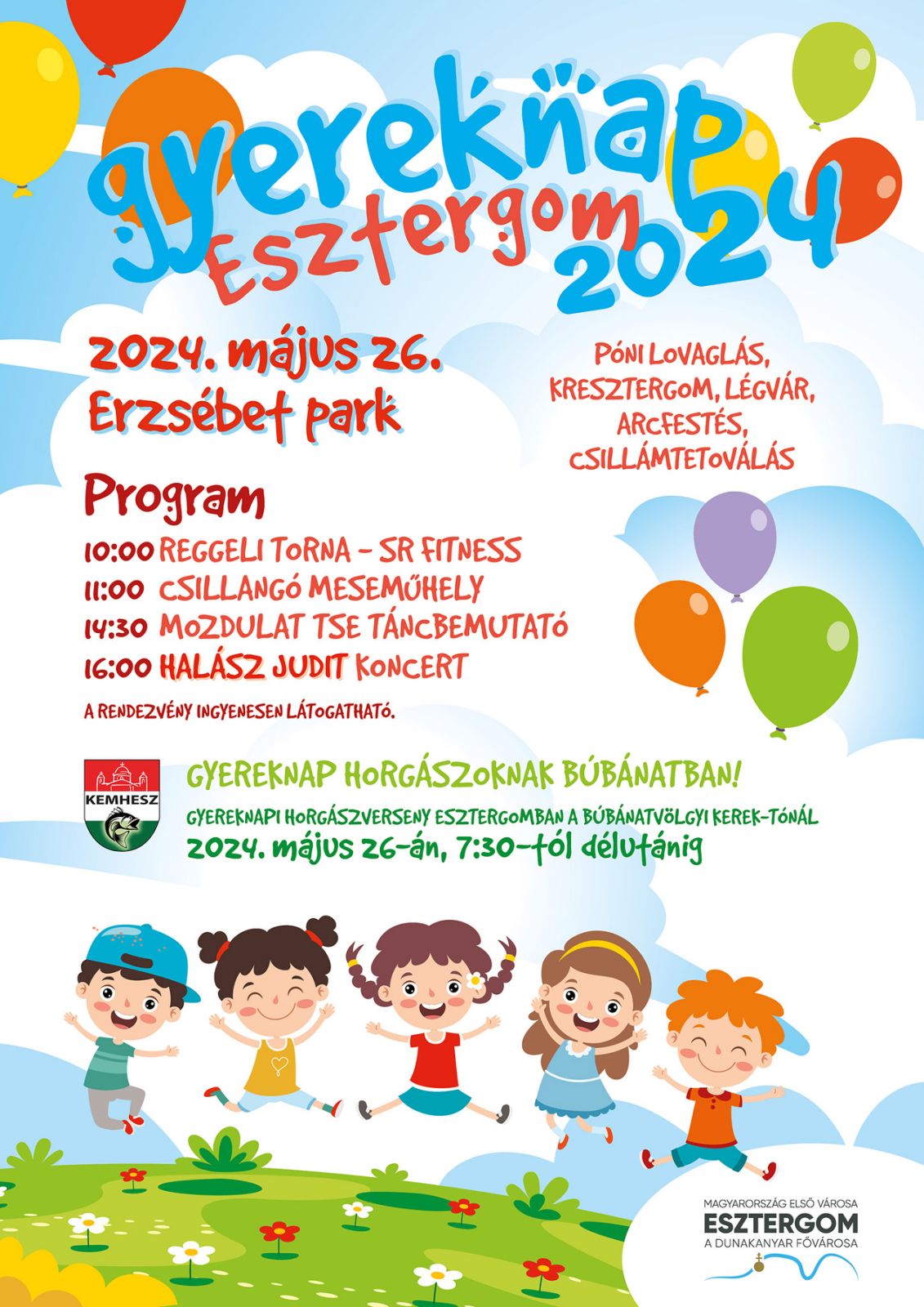 Pónilovaglás, csillámtetoválás, arcfestés, légvár, kresztergom, torna, mese és minden korosztály kedvence, az idei gyereknap sztárfellépője: a legendás Halász Judit!