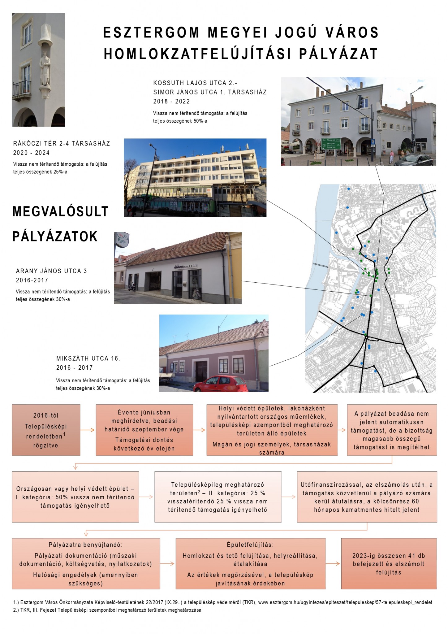 Esztergom Megyei Jogú Város kiemelten foglalkozik azzal, hogy anyagi támogatásokkal és egyéb ösztönzőkkel segítse elő az épített örökség védelmét, a településkép meghatározó elemeinek megőrzését. A lakosság számára elérhető Homlokzatfelújítási pályázat feltételeit a város Településképi Rendelete (22/2017 (IX.29.)) tartalmazza.