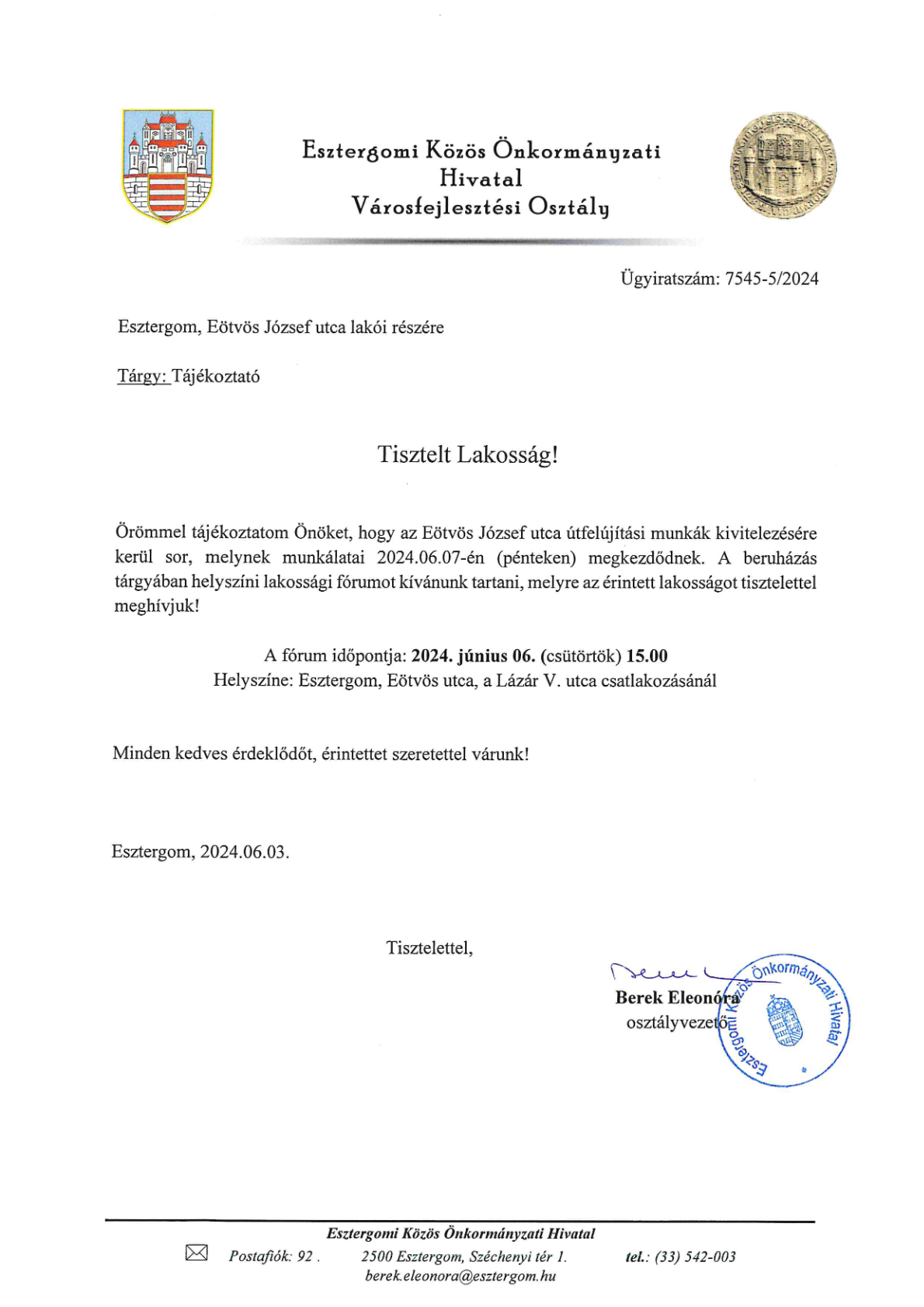 Tájékoztatjuk a Tisztelt Lakosságot, hogy az esztergomi Eötvös József u. útfelújítási munkálatai az alábbi ütemben várhatók: