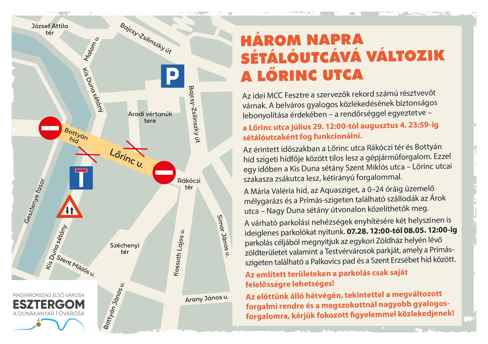 Az idei MCC Fesztre a szervezők rekord számú résztvevőt várnak. A belváros gyalogos közlekedésének biztonságos lebonyolítása érdekében – a rendőrséggel egyeztetve – a Lőrinc utca július 29. 12:00-tól augusztus 4. 23:59-ig sétálóutcaként fog funkcionálni.