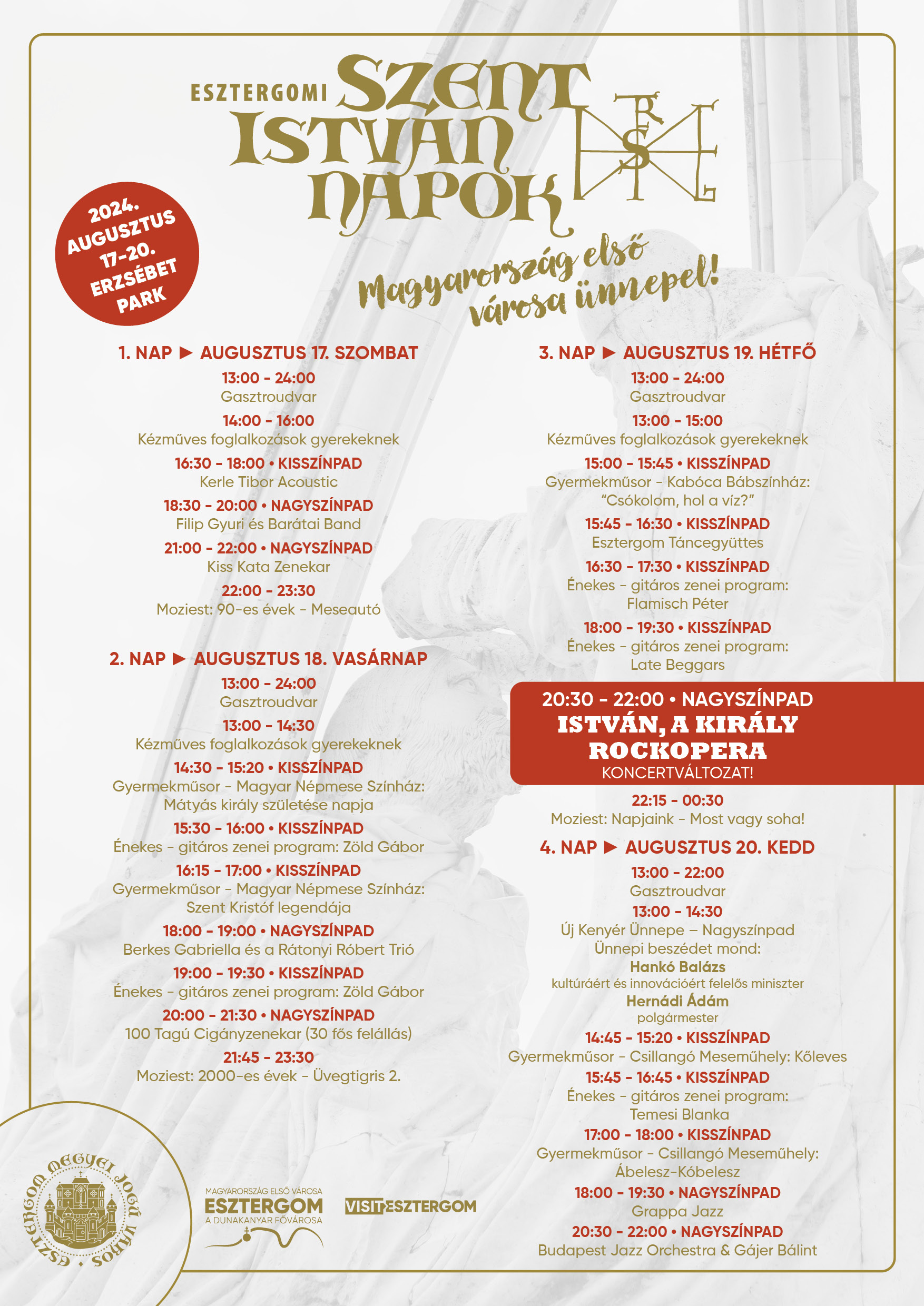 Augusztus 20. Magyarország nemzeti és hivatalos állami ünnepe. Városunk számára különösen fontos ez az ünnep, hiszen lokálisan is kötődünk hazánk történelmi alappilléreihez. Szent István, az államalapítás, a kereszténység mind-mind szerves részei esztergomi identitásunknak. Ezért ebben az évben, a hagyományoktól eltérően nem 3, hanem 4 napon keresztül (augusztus 17-18-19-20.) válogathatunk a színes és izgalmas programok közül Magyarország első városában. A programok helyszíne idén is az Erzsébet park, ahol két színpaddal, gasztroudvarral, kézműves vásárral és kertmozival várják a lakosokat.