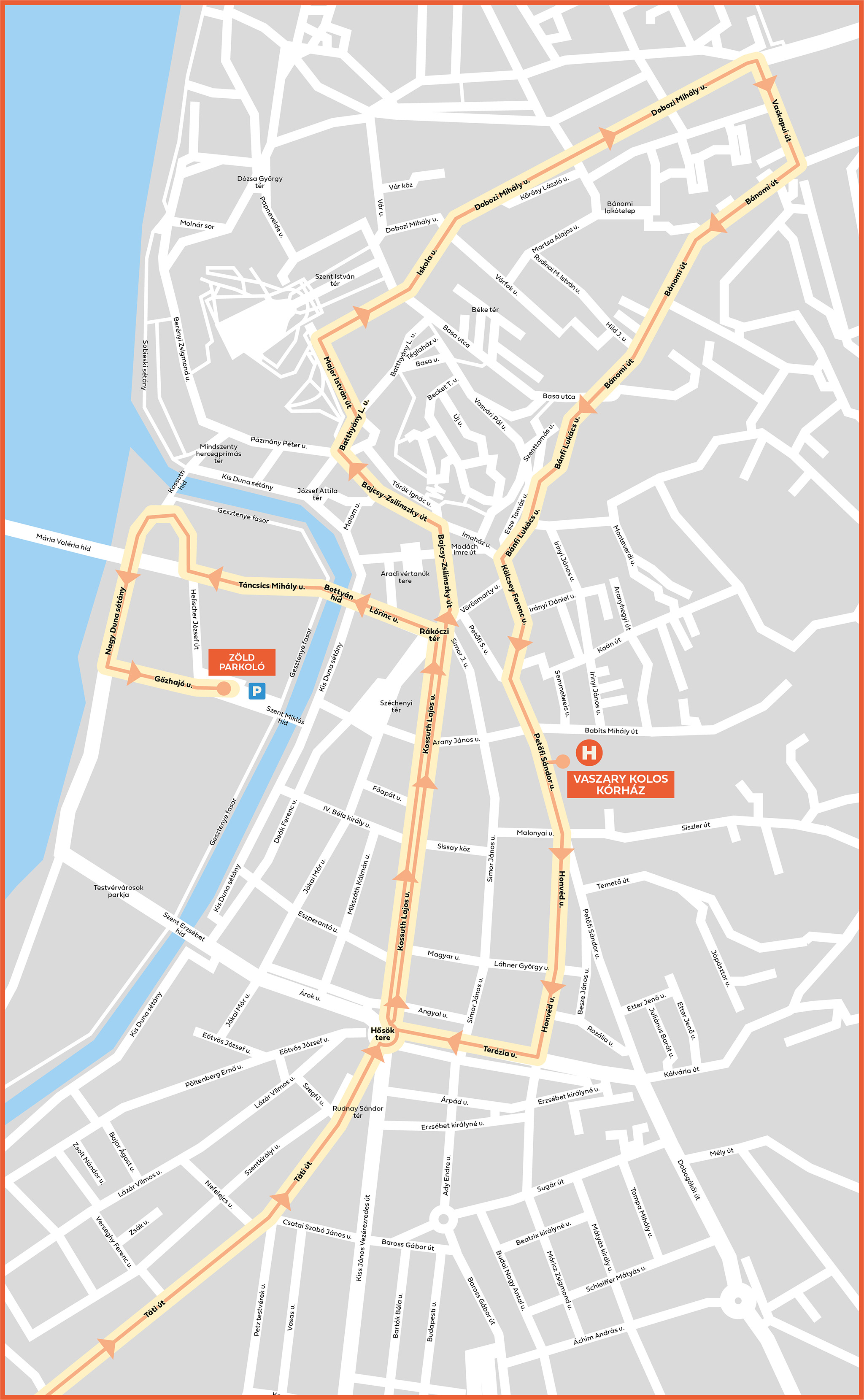 Dorog, Köztársaság út - Gorkij utca (vasúti átjáró) - Bécsi út (10-es számú főút) – Tokodaltáró, József Attila út – Tokod, Kossuth L. út - Széchenyi utca - 1118-as számú út, - 1119-es számú út, - Tát, Malom dűlő utca - 10 -es számú főút – Tát, Fő út – Tát, Halászcsárda - 117-es számú főút - 11-es számú főút – Esztergom, Táti út - Hősök tere körforgalom – Kossuth Lajos út - BajcsyZsilinszky út - Majer István út - Iskola út - Dobozi Mihály út - Vaskapui út - Bánomi út - Bánfi Lukács út - Kölcsey Ferenc út - Petőfi Sándor út -- Vaszary Kolos kórház - Petőfi Sándor út – Honvéd utca - Terézia út - Hősök tere - Kossuth Lajos út – Lőrinc utca – Bottyán híd – Táncsics Mihály utca – Nagy Duna sétány – Gőzhajó utca – Zöld Parkoló (Suzuki Aréna mögött)
