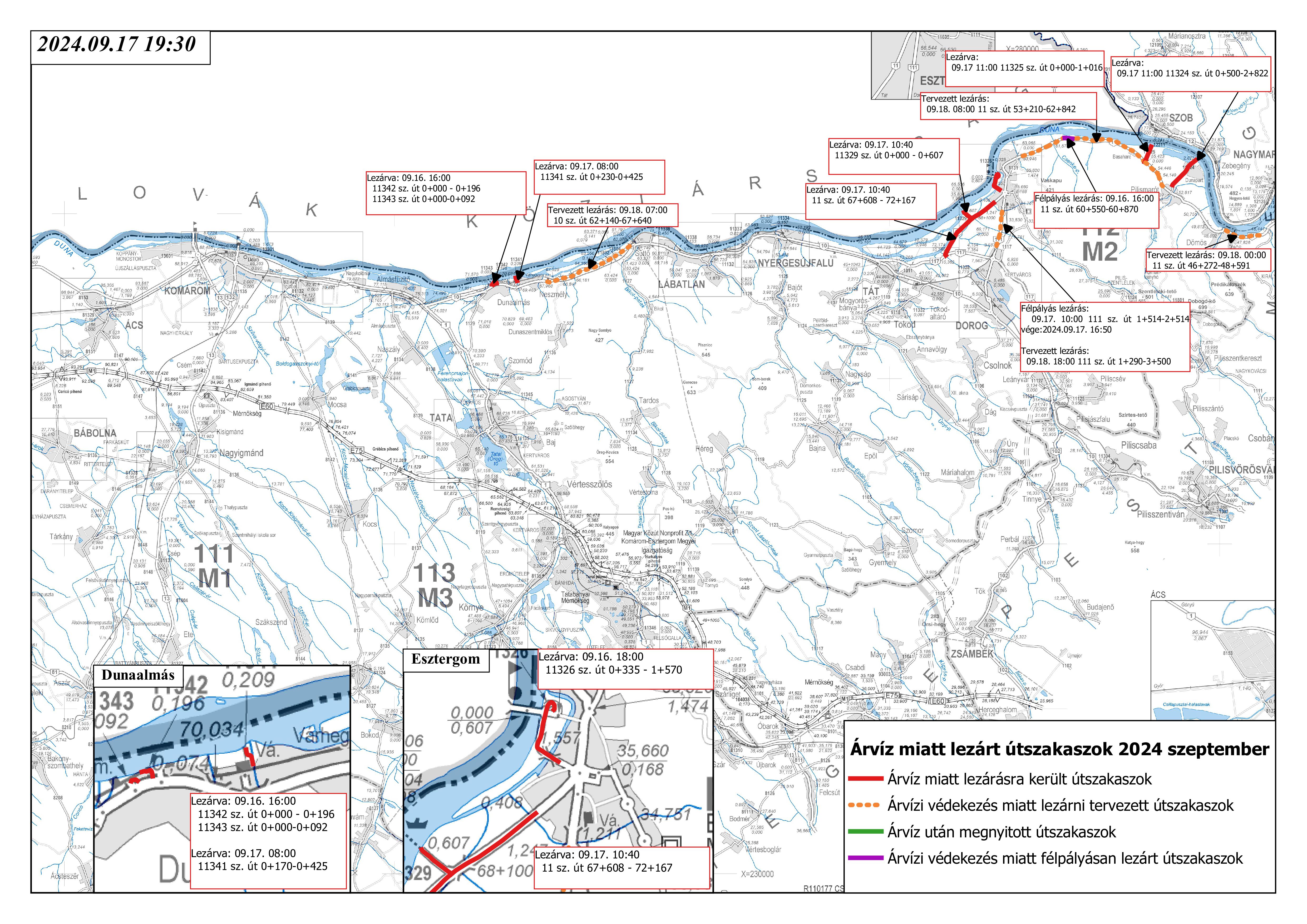 A mai napon (09.17.) 10:00 órától gátépítés miatt félpályás útlezárás lesz a 111-es út 1 km-es szakaszán (az 1+514-2+514 km szelvények közötti szakaszon), valamint magas vízállás miatt délelőtt 10:00 órától teljes útlezárás alá kerül a 11-es út Esztergom-Tát közötti szakasza 4,6 km hosszúságban (a 67+608-72+167 km szelvények között).