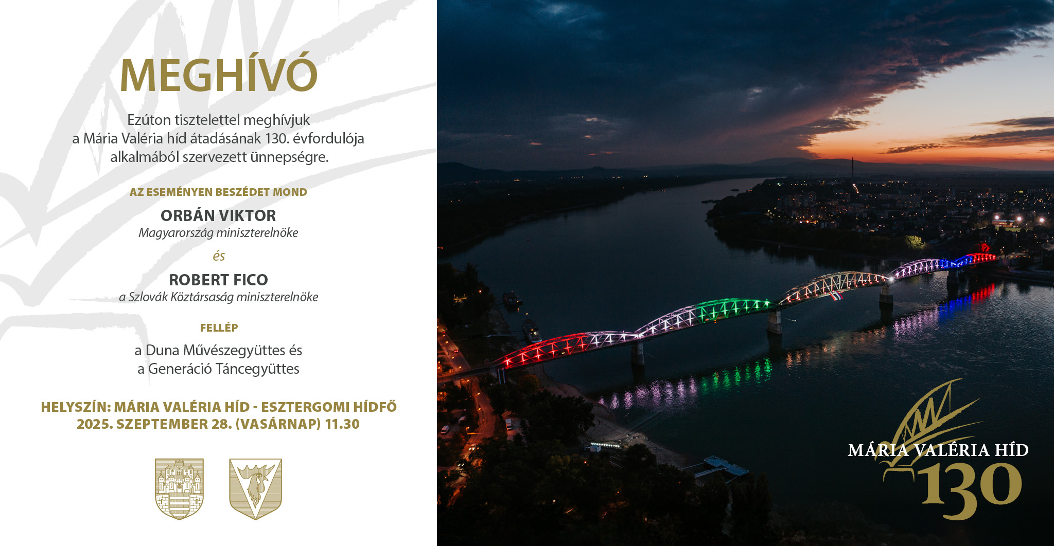 Ezúton tisztelettel meghívjuk a Mária Valéria híd átadásának 130. évfordulója alkalmából szervezett ünnepségre.