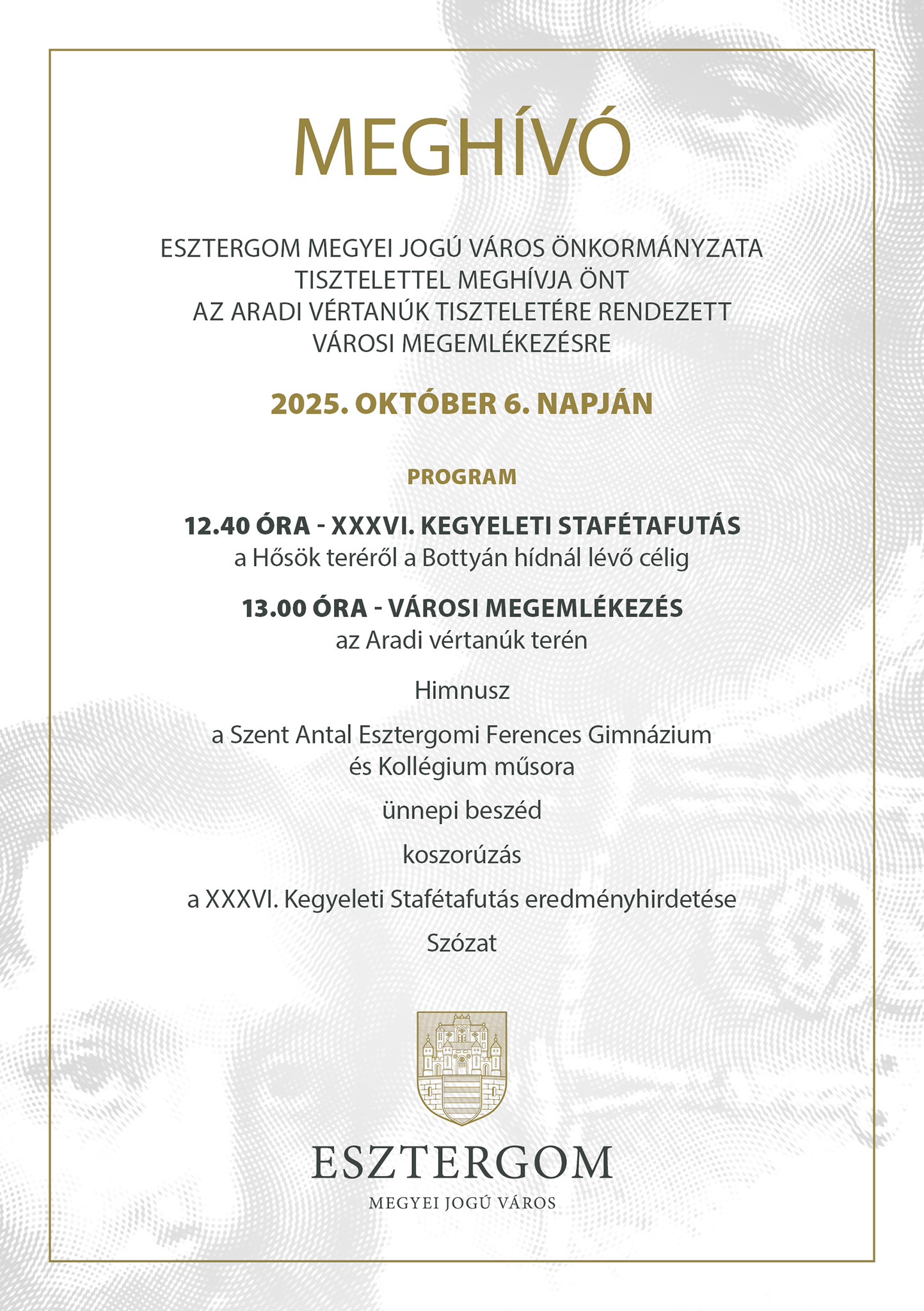 Esztergom Megyei Jogú Város Önkormányzata tisztelettel meghívja az október 6-án, az aradi vértanúk tiszteletére rendezett városi megemlékezésre, amelyen közösen hajtunk fejet az aradi vértanúk emléke előtt.