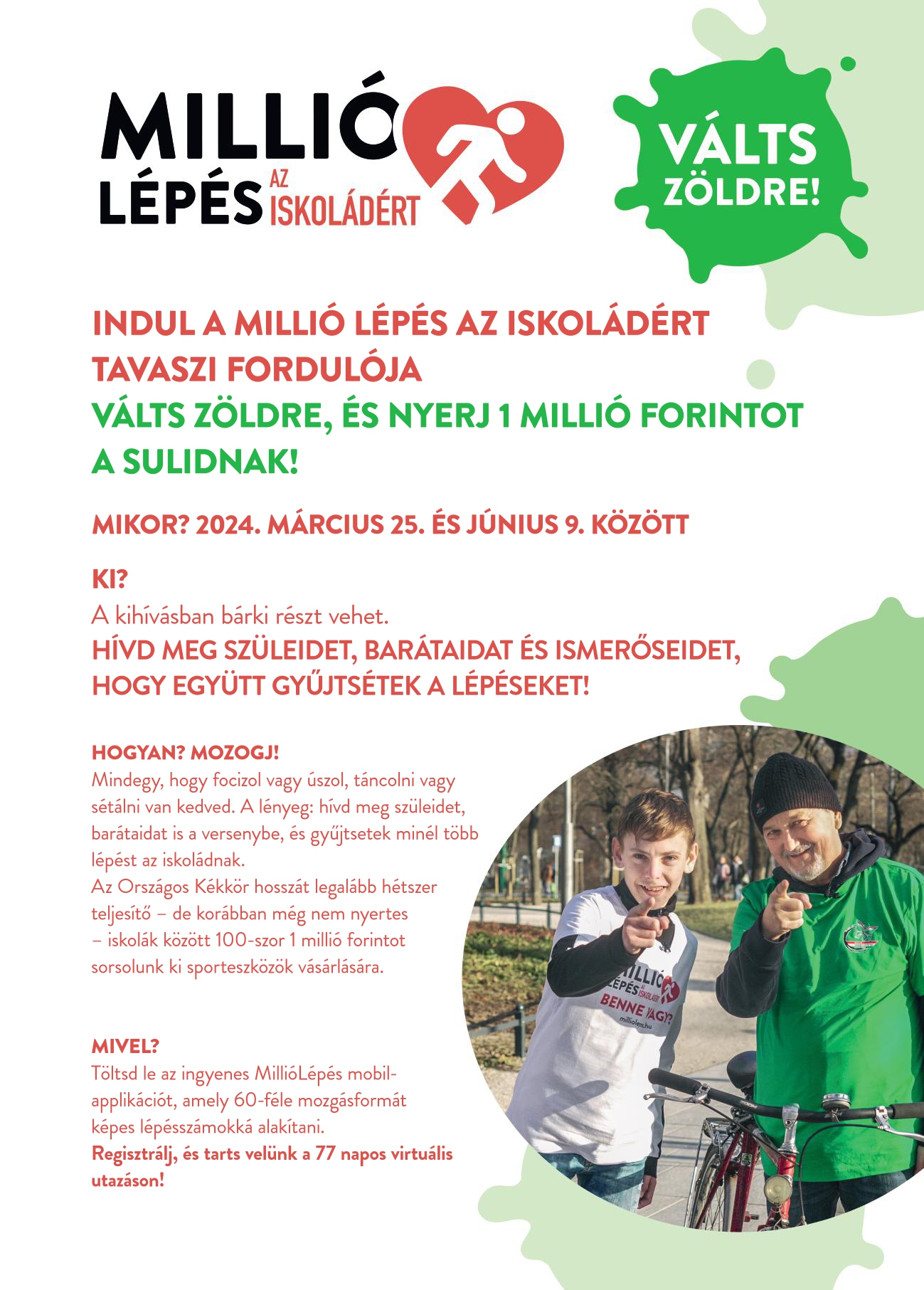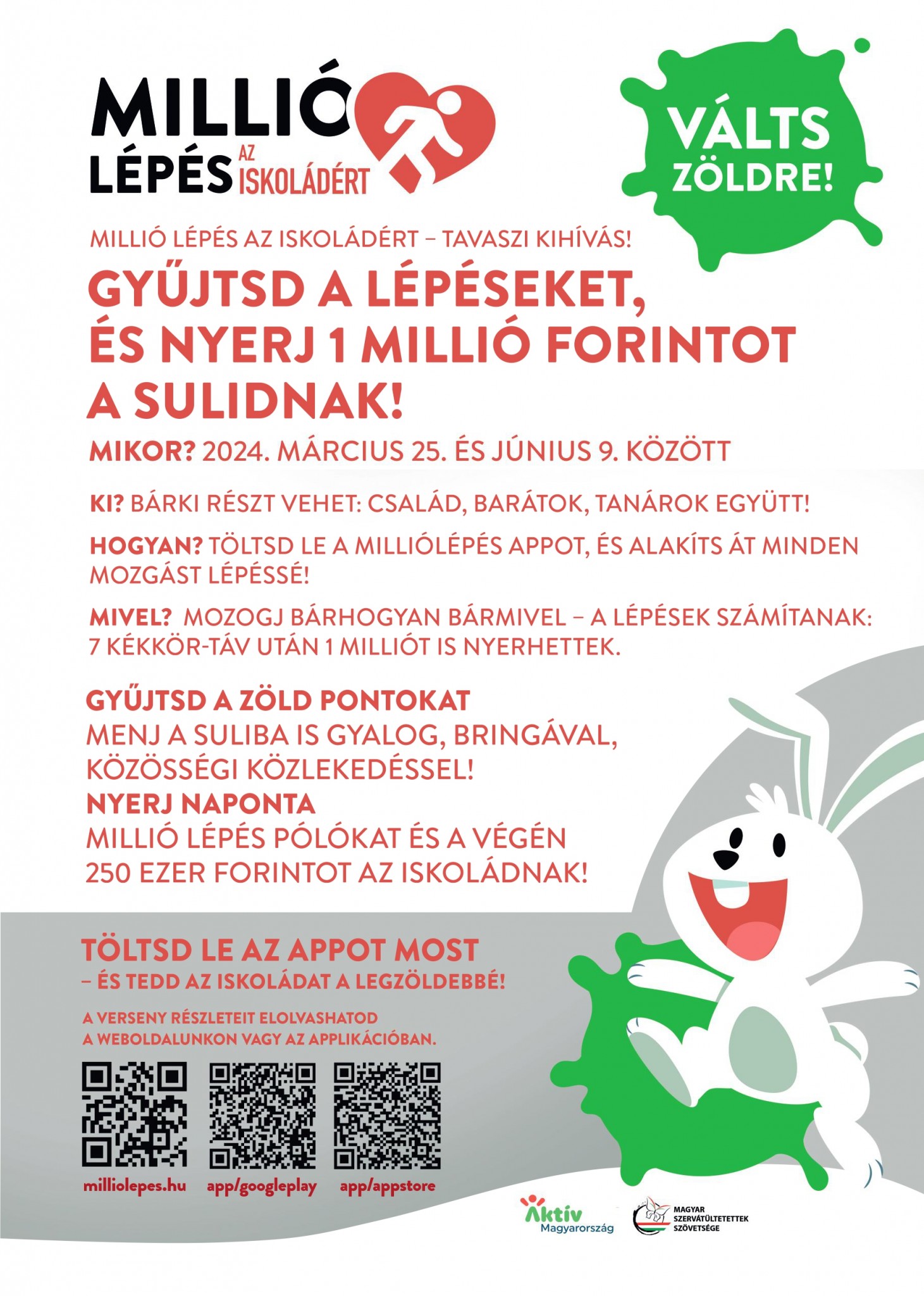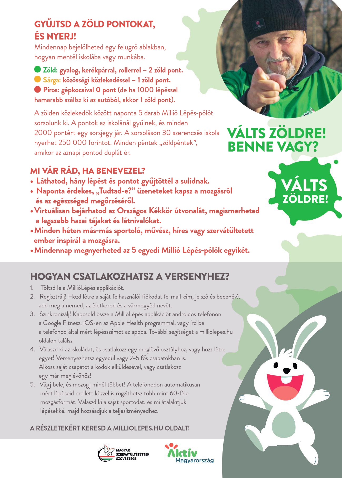 A Millió lépés programban a Magyar Szervátültetettek Szövetsége betegszervezet ingyenes Millió lépés applikációjának letöltésével tudsz részt venni. Az applikáció egységesen, lépésszámokban kifejezve mutatja meg a napi fizikai aktivitásodat. Több mint 60 féle mozgás időtartamát beírva az app ezeket lépésekké alakítja. Látod benne a napi a heti és a regisztrációd óta megtett összesített lépésszámodat. Megnézheted, hogy nemenként, 10 éves korcsoportonként de megyénként és településenként is, hogy a lépésszámaid alapján hanyadik vagy a rangsorban. Ha akarsz, alakíthatsz 1-5 fő közötti csapatot( részletek itt) amelyben látjátok egymás teljesítményét és azt is, hogy a csapatotok hanyadik a rangsorban. Mindezen felül részt vehetsz az iskolák versenyében is, amennyiben csatlakozol egyhez(részletek itt) segítve őket a sporteszközökért folyó nyereményjátékban. A játék időtartama alatt minden nap kapsz egy Tudtad-e? üzenetet, amelyben az egészséged számára fontos információ van.