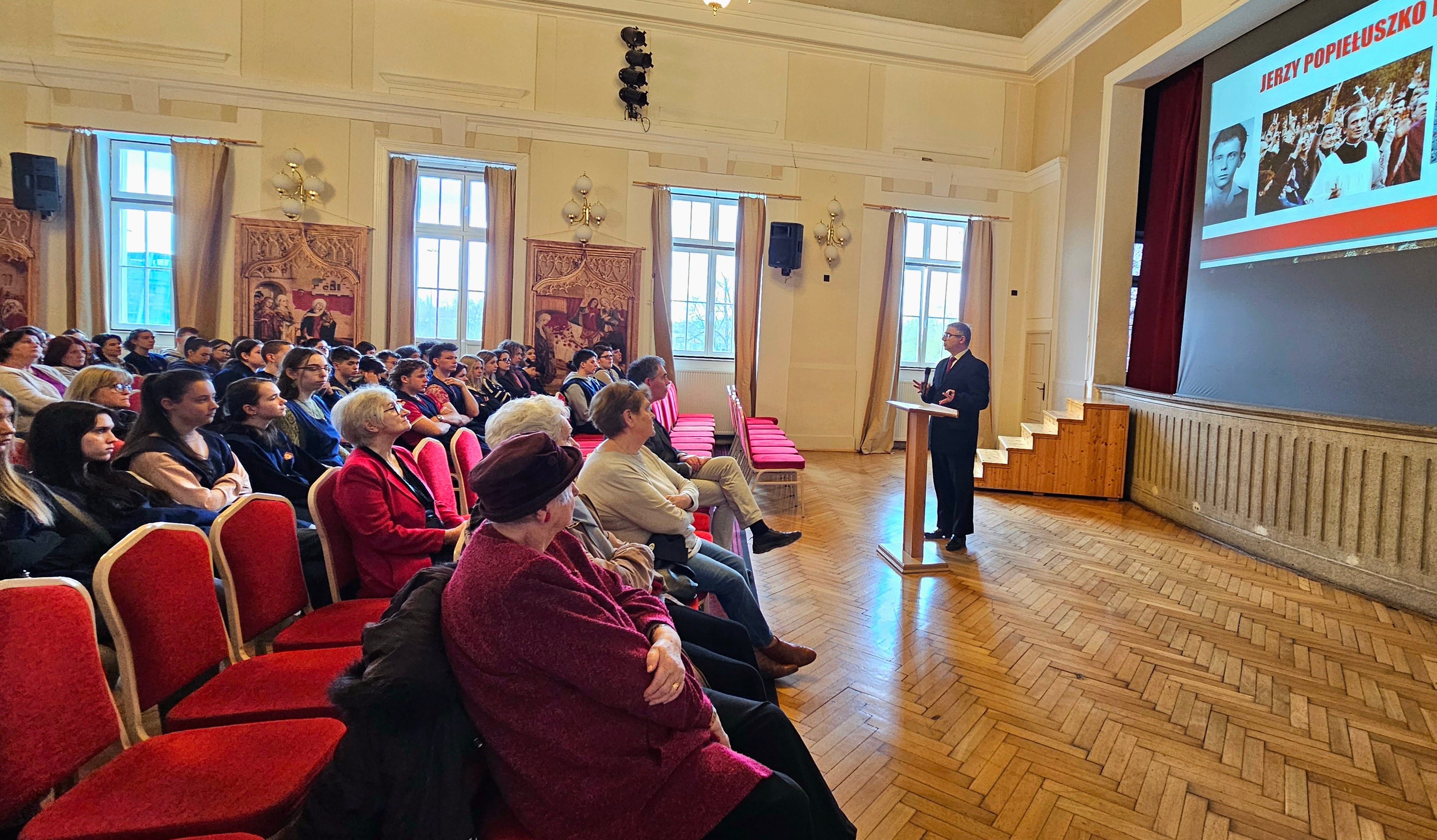 "A gimnázium igazgatója, Valkó Miklós készségesen fogadott bennünket, amit szívből köszönünk. A mártírhalált halt atyáról dr. Soós Viktor Attila, a Nemzeti Emlékezet Bizottságának tagja tartott igen érdekes előadást vetítéssel színezve. Neki is köszönjük a közreműködést. A diákok és a Lengyel Nemzetiségi Képviselők mellett többen is jelen voltak az Esztergomi Magyar-Lengyel Baráti Társaság részéről." - árulta el Horváth Mihályné, az ELNÖ képviselője.