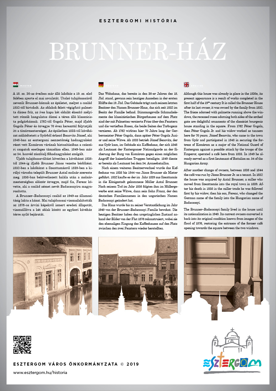 A Brunner–Badacsonyi család az 1949-es államosításig lakta a házat. Mai tulajdonosai visszaalakították az 1876-os árvízi képekről ismert eredeti állapotát, visszaállítva a két ablak között az egykori kávéház térre nyíló bejáratát.