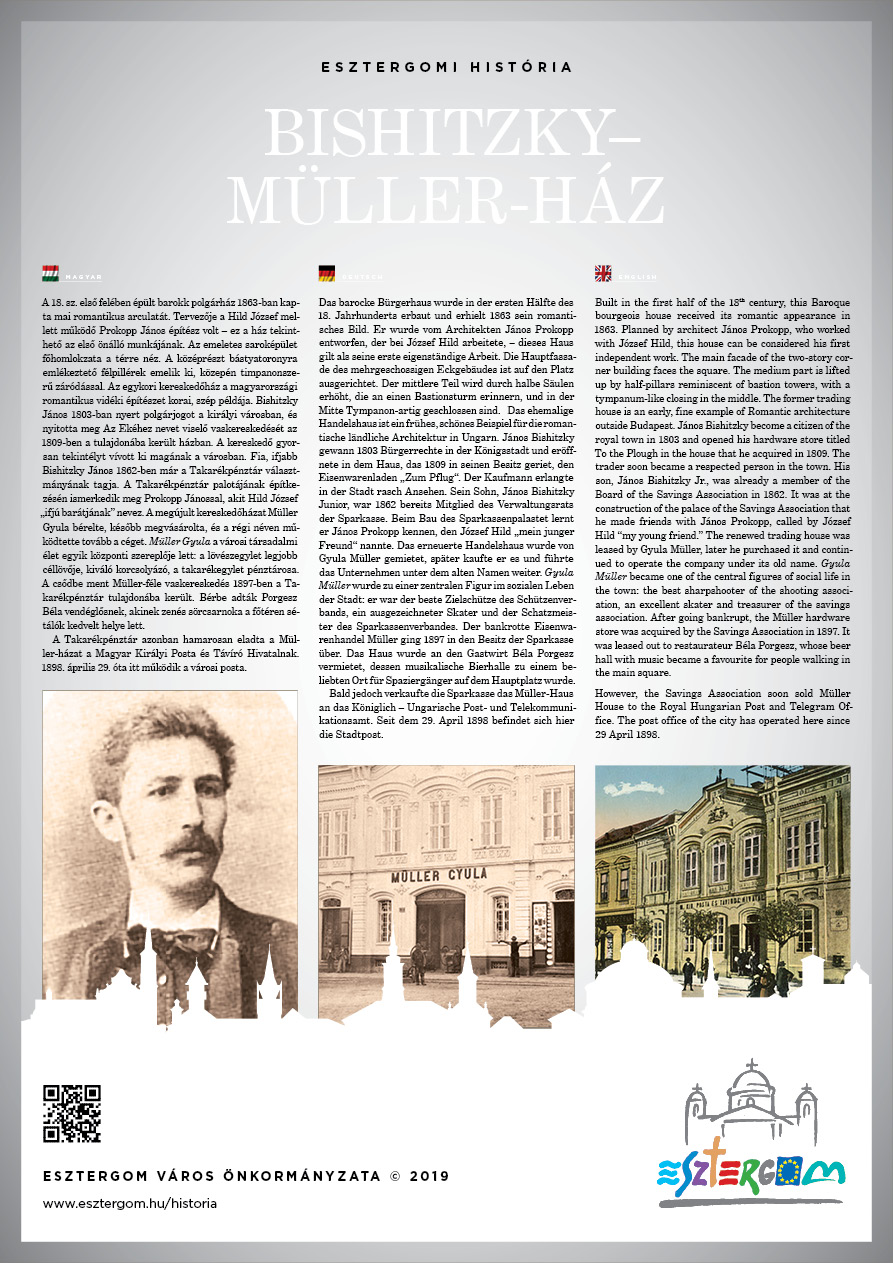 Az emeletes saroképület főhomlokzata a térre néz. A középrészt bástyatoronyra emlékeztető félpillérek emelik ki, közepén timpanonszerű záródással. Az egykori kereskedőház a magyarországi romantikus vidéki építészet korai, szép példája. Bishitzky János 1803-ban nyert polgárjogot a királyi városban, és nyitotta meg Az Ekéhez nevet viselő vaskereskedését az 1809-ben a tulajdonába került házban. A kereskedő gyorsan tekintélyt vívott ki magának a városban. Fia, ifjabb Bishitzky János 1862-ben már a Takarékpénztár választmányának tagja. A Takarékpénztár palotájának építkezésén ismerkedik meg Prokopp Jánossal, akit Hild József „ifjú barátjának” nevez.