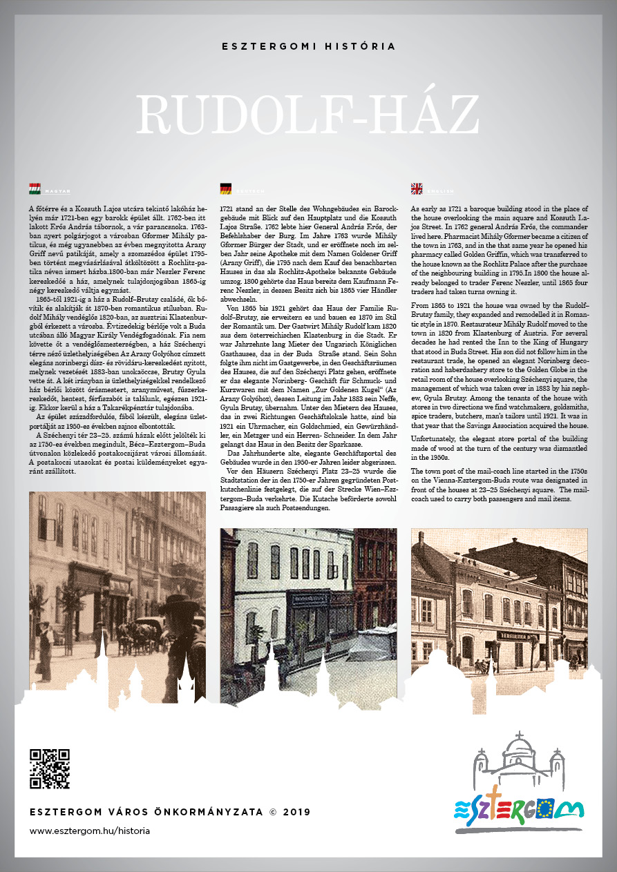 1865-től 1921-ig a ház a Rudolf–Brutsy családé, ők bővítik és alakítják át 1870-ben romantikus stílusban. Rudolf Mihály vendéglős 1820-ban, az ausztriai Klastenburgból érkezett a városba. Évtizedekig bérlője volt a Buda utcában álló Magyar Király Vendégfogadónak.