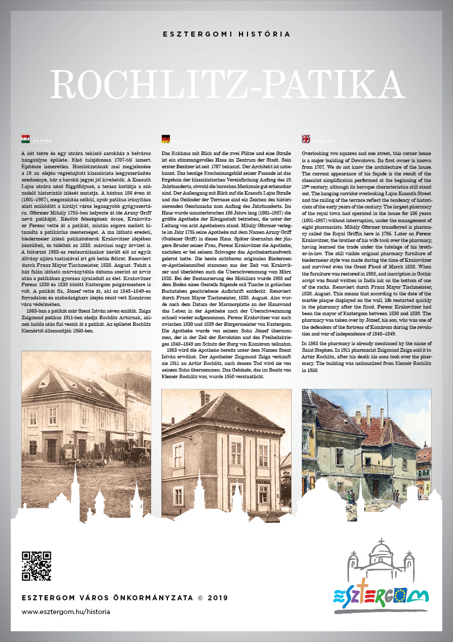 1863-ban a patikát már Szent István néven említik. Zsiga Zsigmond patikus 1911-ben eladja Rochlitz Artúrnak, akinek halála után fiai veszik át a patikát. Az épületet Rochlitz Elemértől államosítják 1950-ben.
