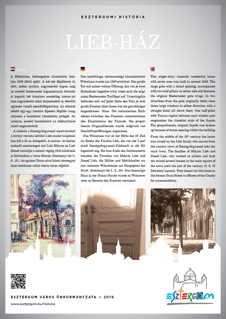 A lakóház a Szentgyörgymező mezővárosból a királyi városba költöző Lieb család tulajdonában állt a 19. sz. közepétől. A molnár- és lisztkereskedő-mesterséget űző Lieb Mátyás és Lieb József családjai a század végéig több lakóházat is birtokoltak a város főterén (Széchenyi tér 2., 6., 10.). Az egykori Duna utcai házat vármegyei tisztviselőknek adták bérbe lakás céljából.