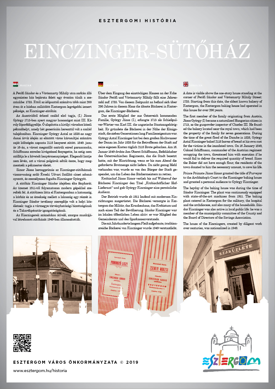 A Petőfi Sándor és a Vörösmarty Mihály utca sarkán álló egyszintes ház bejárata felett egy évszám tűnik a szemünkbe: 1735. Ettől az időponttól számítva több mint 200 éven át e házban működött Esztergom legrégebbi ismert péksége, az Einczinger-sütőház.